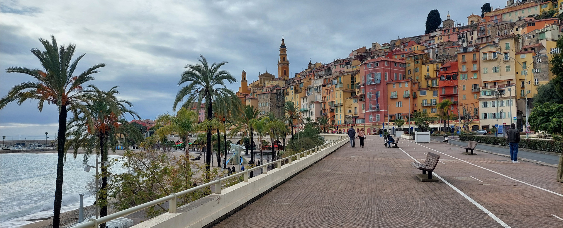 Am Flughafen in Nizza erwarteten sie mich bereits mit einem strahlenden Lächeln, trotz Wind und Nieselregen und einer kleinen Bombendrohung vor Ort. Wir fuhren durch abendliche Lichter und Silhouetten zu unserem Zielort Menton. Dort hatten meine Freunde ein Zimmer ihrer Ferienwohnung für mich vorbereitet, in einem ehemaligen Hotel.